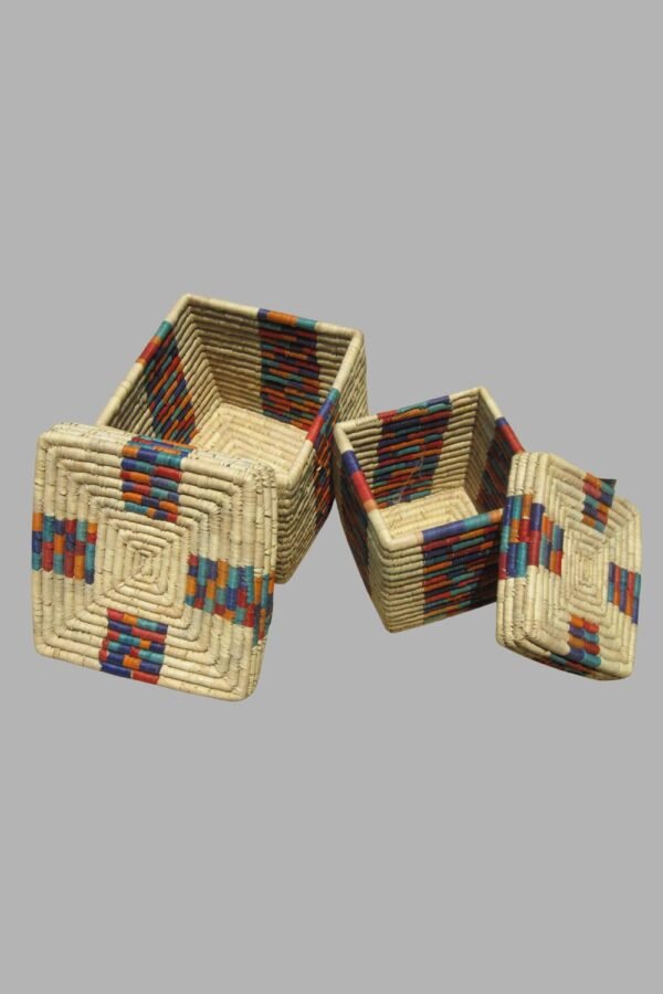 Introducing our Date Palm Leaf & Grass Khope Box Multi Col Big – a spacious and environmentally-friendly storage box that combines traditional craftsmanship with vibrant colors. Handcrafted from sustainable date palm leaves and grass, this box is designed to enhance your home organization while adding a touch of cultural charm.