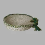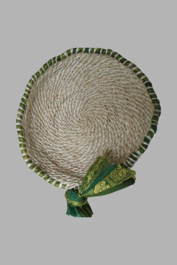 A sari border on a jute basket is a beautiful fusion of traditional and eco-friendly design. These baskets are crafted using natural jute material, and the sari border adds a vibrant touch of cultural artistry. Often handwoven, the combination of rustic jute and colorful sari accents makes them perfect for home decor, gifting, or storage purposes. They blend sustainability with style, reflecting a commitment to both functionality and aesthetic appeal.