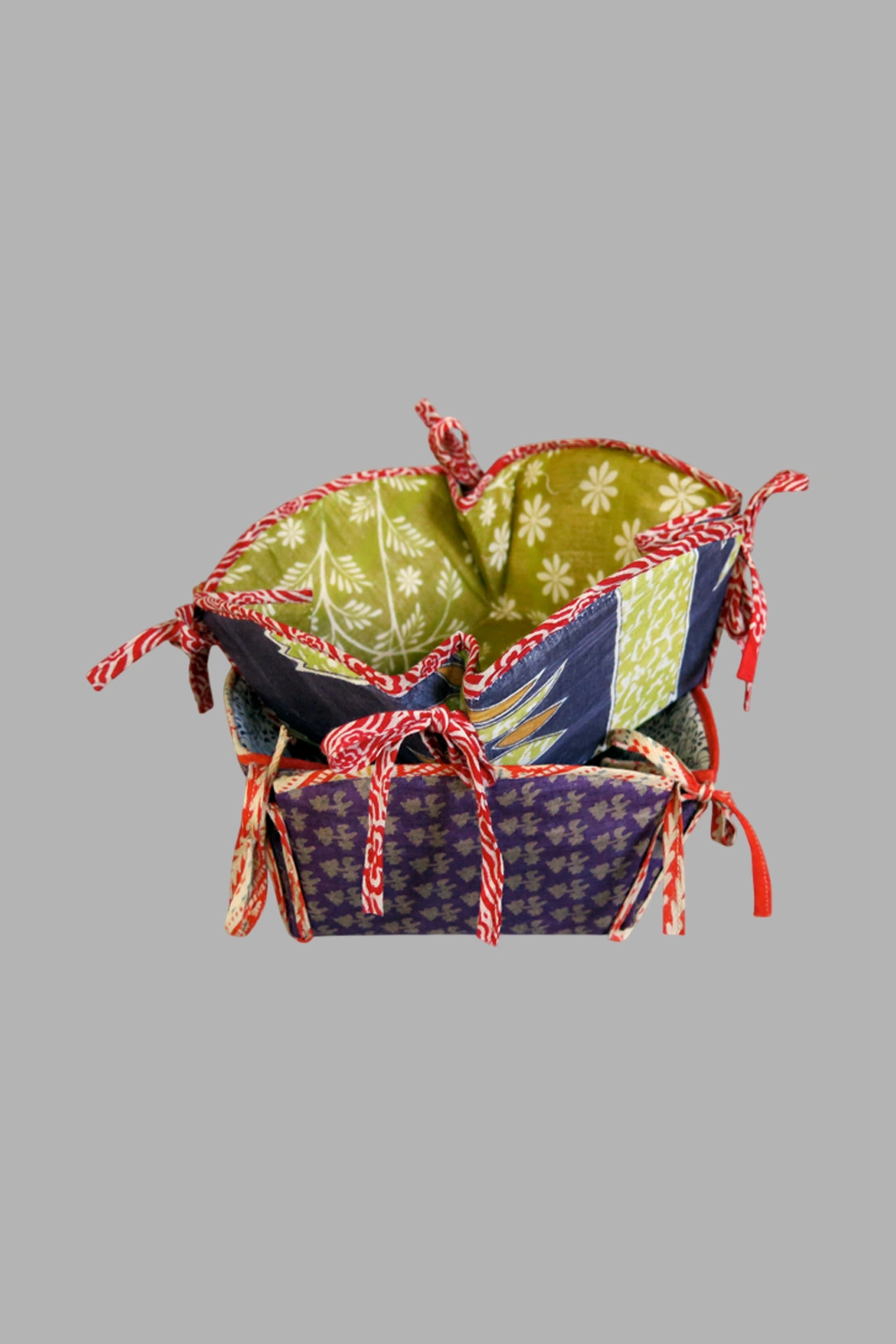 A sari bread basket is a unique and eco-friendly storage solution, crafted using vibrant, recycled sari fabric. This handcrafted basket features the colorful patterns and textures of traditional sari materials, making it a stylish and cultural addition to any dining or kitchen space. Ideal for holding bread, rolls, or other baked goods, it combines practicality with aesthetic appeal. The sari fabric adds a touch of warmth and vibrancy to your table setting while promoting sustainable practices by repurposing textiles.