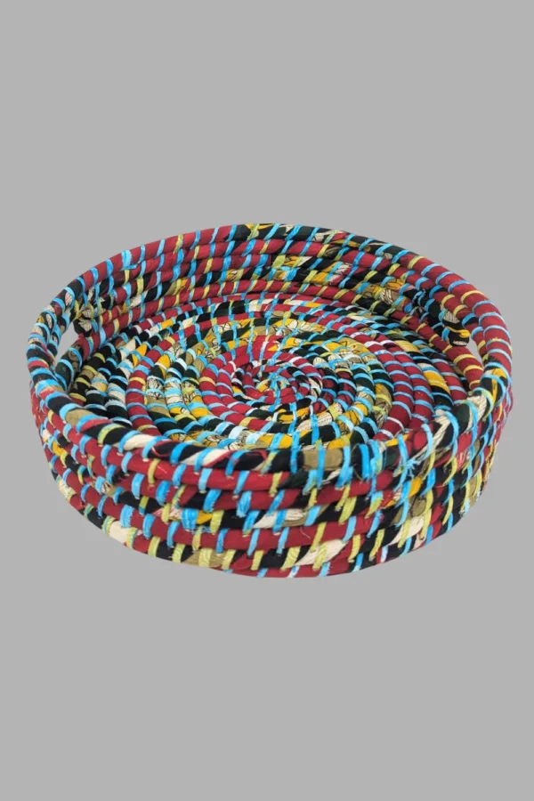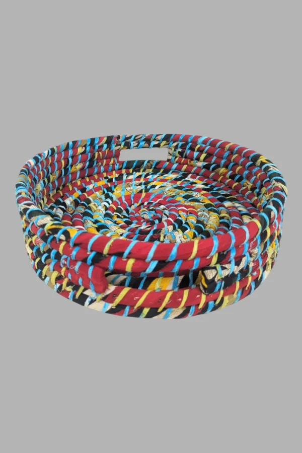 Impress your guests with our Sari Round Tray with Handle, perfect for serving snacks or drinks. Handcrafted from recycled saris, each tray is unique and adds a touch of elegance to any gathering.